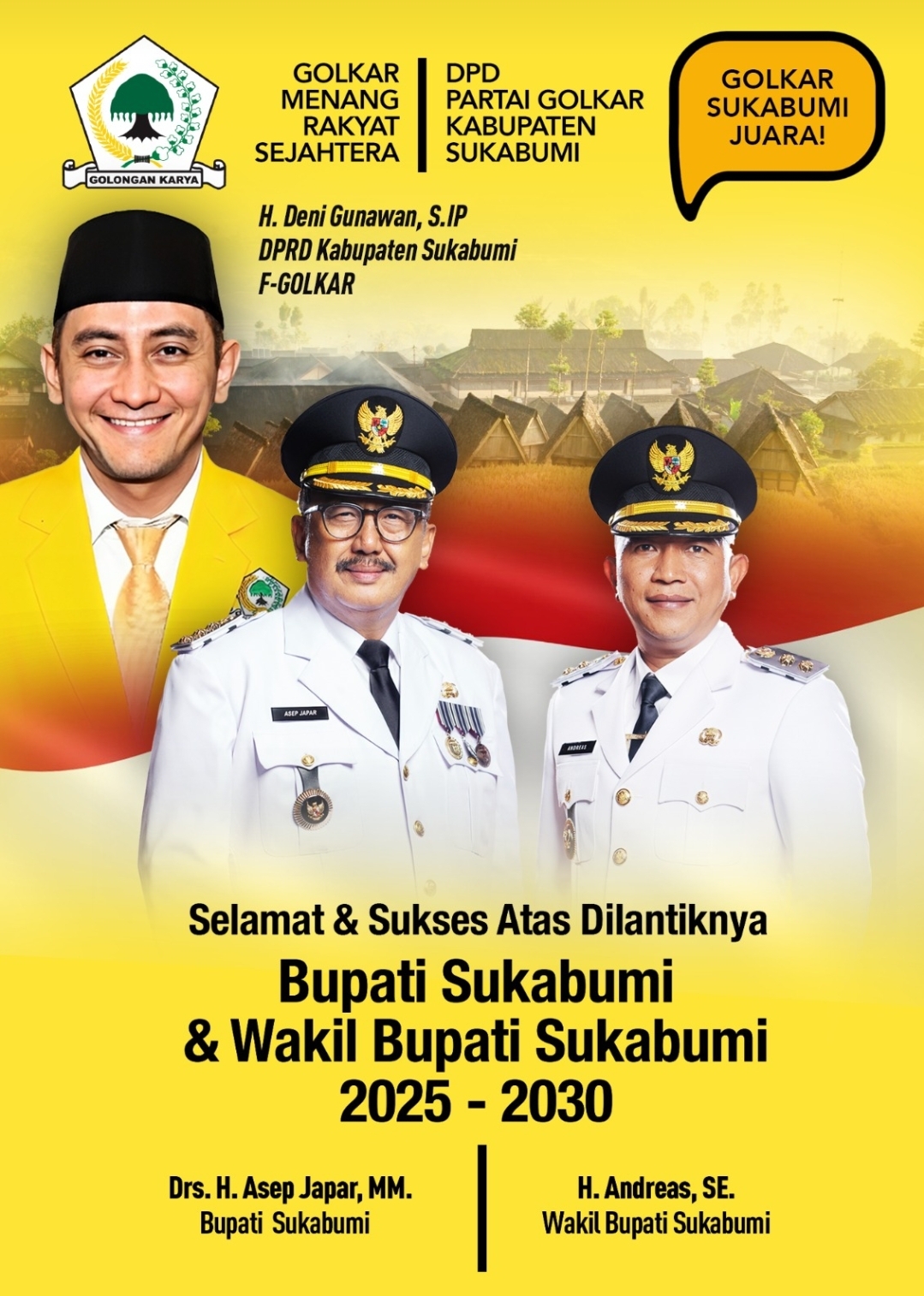 Sukabumiterkini.com  Ketua Harian Partai Golkar Kabupaten Sukabumi dan anggota DPRD Kabupaten Sukabumi, H. Deny Gunawan, S.IP, menyampaikan ucapan selamat dan sukses kepada H. Asep Japar, MM dan H. Andreas, SE atas pelantikan mereka sebagai Bupati dan Wakil Bupati Sukabumi periode 2025-2030. Pelantikan tersebut menandai dimulainya kepemimpinan baru di Kabupaten Sukabumi untuk lima tahun ke depan.